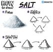 №51 Соль, как и любые другие сыпучие материалы, на скетче выглядит как простые треугольники. Чтобы добавить объёма, сделайте нижнюю линию закруглённой. Соль бывает разного размера: от мелкой до очень крупной. Это тоже можно передать на скетче. Для мелкой соли — прямые линии, для крупной — ломаные. Если добавлять тень, линия тени будет настолько же неровной, насколько и края самой кучки. А ещё небольшие крошки вокруг добавят ей натуральности. -