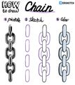 Чтобы нарисовать узнаваемую цепь, достаточно двух-трёх звеньев, но при желании можно нарисовать и больше. Сначала нарисуйте прямоугольники с закруглёнными краями на небольшом расстоянии друг от друга, а потом соедините их по бокам полуовалами той же толщины. Ещё можно добавить тени и блики. -
