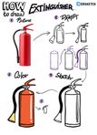 Огнетушитель состоит из корпуса, запорно-пускового устройства и распылителя. Есть разные виды огнетушителей, но узнаваемыми их делает сочетание этих частей. Начнём с корпуса. Это высокий цилиндр, красный, если вам есть чем его покрасить. Сверху — рычаг и рукоятка запорно-пускового устройства, которые надо сжать, чтобы начать тушить. От них выходит трубка. У углекислых огнетушителей на конце ещё раструб. -