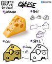 Сегодня рисуем сыр. Не у каждого сыра есть дырки, но именно дырки с лёгкостью превращают неизвестный ломоть чего-то в ломоть сыра, поэтому будем рисовать сыр с дырками. Для начала нам понадобится параллелограмм (скошенный прямоугольник) с заранее проделанными дырками. Сверху к нему пририсуем треугольник, у которого одна из сторон округлая. Остаётся добавить дырки: сперва обведём те, что проделали в параллелограмме, а потом добавим ещё несколько в свободных местах. Ещё на один из краёв сыра можно добавить тень, а в дырки – тень погуще. -