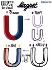 У магнита два полюса – северный и южный. Если магнит разрезать пополам, то у каждого куска тоже будет два полюса: северный и южный. Чтобы полюса были поближе друг к другу и магнит сильнее примагничивался к металлу, его загибают в форме подковы. У постоянных магнитов северный полюс обычно красят в синий цвет, а южный — в красный. А ещё мы летим через космос на гигантском магните, поэтому компас работает. Его стрелка притягивается к полюсам Земли. Правда притягиваются противоположные полюса, так что получается, что северный магнитный полюс находится на юге. А рисовать его просто. Начинаем с буквы U. Разделяем её черточкой посередине. Добавляем объём и цвет. -