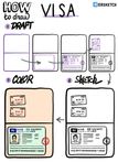 №23 Виза — это такая хитрая штука, без которой некоторые человекоподобные обезьяны не могут посещать некоторые места. У меня вот один раз был случай, когда я собирался на конференцию в Европу, и у меня всё было готово, кроме визы. А визу мне дали за день до конференции. Это было довольно нервно. Виза представляет собой наклеечку на странице паспорта, поэтому для того, чтобы её нарисовать, сперва нарисуем паспорт. Потом нарисуем саму наклеечку, добавим на неё фотографию, описание, коды и печать. А чтобы вторая страница паспорта не была пустой, добавим на неё печати о въезде и выезде из страны. -