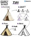 №50 Типи — это такая индейская палатка. Она состоит из прямых палок, составленных домиком, и натянутых вокруг шкур или парусины. В середине конструкции есть отверстие для выхода дыма, поэтому внутри можно разводить костёр. Чтобы нарисовать типи, нужно начать с двух пересекающихся сверху палок. Затем аккуратно добавить завёрнутую вокруг них ткань, чтобы было видно отверстие для дыма. Далее нарисовать нижнюю часть, чтобы выглядело, как будто это палки, обёрнутые тканью. И добавить верёвку, которая держит всё это сверху.