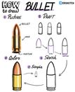 №52 Пуля — это то, что вылетает из пистолета при стрельбе, а рисовать мы будем патрон. Помимо самой пули в патроне есть гильза с капсюлем. Капсюль — это такой маленький колпачок, внутри которого загорающийся от удара состав. Капсюль поджигает порох, которым наполнена гильза. Сгорающий порох толкает пулю через ствол, и она улетает в мишень. -
