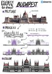 №7 Сегодня будем рисовать Будапешт, а именно - здание Венгерского парламента Орсагхаз. Я очень люблю рисовать здания, потому что, выполняя большое количество очень простых действий, можно получить впечатляющий результат. Рисуешь очень много палочек, кружочков и треугольников, а потом смотришь, что получилось, и удивляешься. Недостаток только один - много времени нужно. Я вот эту картинку с одного раза не смог закончить. Так что запасайтесь кофейком, включите музыку или аудиокнижку и начинайте. Сперва сделаем набросок. Это нужно, чтобы увидеть основные части здания. Я как-то заметил, что чтобы что-то увидеть, недостаточно просто на это посмотреть. Когда попробуешь нарисовать, видишь в два раза больше. По наброску понятно, из чего состоит здание, и можно рисовать фундамент. В этот момент надо не переборщить с вертикальными деталями. Вообще во всех зданиях есть вертикальный и горизонтальный ритм, по которому здание можно разделить на слои. Фундамент задаст основные вертикальные направляющие. Левая, правая и центральная башни на переднем плане, а то, что между ними, - на заднем. Линии заднего плана в фундаменте расположены чуть ниже. Если взять ширину центральной башни за 3, то ширина крайних получится примерно 2, а соединений - примерно 4. Теперь нарисуем центральную башню. Она задаст горизонтальные направляющие. Начинайте снизу вверх, как слоеный пирог. На отдельной картинке показано, из каких слоёв она состоит. Каждый горизонтальный слой делится на 9 вертикальных. На пересечении слоёв окошки, арки или башенки. Дальше крылья. Там есть большие арки, которые зададут вертикальный ритм. Там 14-15 арок. Через 4 арки от центральной башни начинается средняя башня шириной в 5 арок. От неё вниз идёт лестница шириной в 3 арки. Остались боковые башенки. Они состоят из 5 повторяющихся вертикальных паттернов. Главное не спешить. Линию за линией, арку за аркой, и всё получится. -
