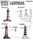 №43 Маяк — это источник яркого света на берегу, который помогает кораблям в море строить маршрут ночью. Имея в поле зрения два маяка, можно довольно точно определить свои координаты на карте. Если поставить маяк возле опасных скал, можно будет всегда видеть, где они, чтобы не подплыть слишком близко. А ещё в книгах и фильмах в маяке всегда происходит что-то интересное. Нарисуем высокую башню, стоящую среди скал. На вершине поместим стеклянный купол с фонарём. А чтобы маяк было хорошо видно и днём — добавим на него красные полосы. Можно ещё тучки и чаек добавить. -