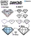 №49 Бриллиант — довольно хитрая конструкция. Сначала я попробовал нарисовать его как на картинке, но получилась каша. Я такое точно не запомню, как рисовать. Пришлось упрощать, а потом упрощать ещё. Вот что получилось: Сначала нарисуем основную форму бриллианта: прямая площадка сверху, затем две линии в стороны, от них две линии, соединяющиеся внизу в одной точке. После этого добавляем горизонтальную линию на стыке сторон. Рисуем две центральные грани, которые под небольшим углом расходятся в стороны симметрично и сходятся в нижней точке. И в конце рисуем две боковые грани, которые выходят из верхних углов и также сходятся в нижней точке. Они должны идти под большим углом, чем центральные. -