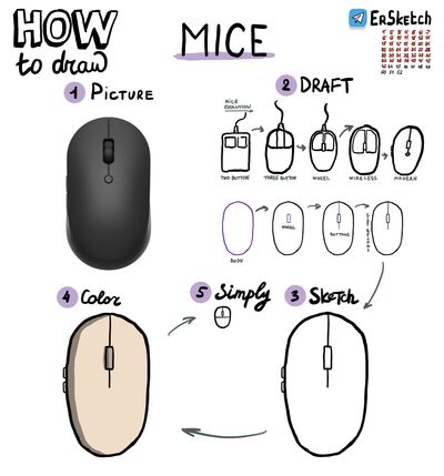 Вот как рисовать мышь: берём что-то вроде овала, в верхней части добавляем прямоугольник (колесо), слева и справа от него обозначаем кнопки. Можно ещё добавить кнопки сбоку, если хочется.