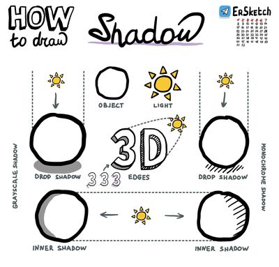 Теперь про два способа рисования. Один можно использовать, если у вас есть под рукой два цвета, второй – если цвет только один. Для цветной тени теневую область нужно закрасить вторым цветом, а для одноцветной – заштриховать.