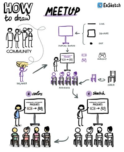 Для того чтобы нарисовать митап, воспользуемся домашними заготовками. Возьмём спикера из 👥 комьюнити. Соберём стенд из простых запчастей. Добавим несколько 🪑 стульев и развернём их лицом к спикеру. Рассадим на них зрителей. Претворимся, что мы на митапе разработчиков игр, и добавим на слайд 🎮 геймпад.