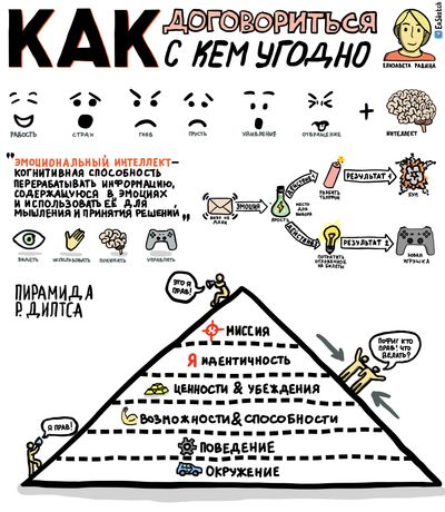 Пирамида Дилтса – инструмент для налаживания взаимопонимания. Суть в том, что люди, которые не понимают друг друга, общаются с разных уровней этой пирамиды. В самом низу – окружение, на втором уровне – поведение, на третьем – возможности, на четвертом – ценности и убеждения, на пятом – идентичность, и на шестом – цель в жизни. Если кто-то говорит: «У нас великая цель стать великой компанией», а кто-то другой говорит: «Нам нужно в срок выполнить задачу», им будет сложно договориться, потому что они говорят с разных позиций. Если такое замечаешь, то нужно либо спуститься на уровень вниз тому, кто сверху, либо подняться на уровень вверх тому, кто снизу, либо пойти навстречу друг другу.