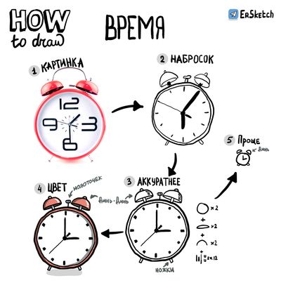 Чтобы нарисовать часы достаточно нарисовать круг и две стрелки, но если время не ждёт – лучше сразу рисовать будильник.