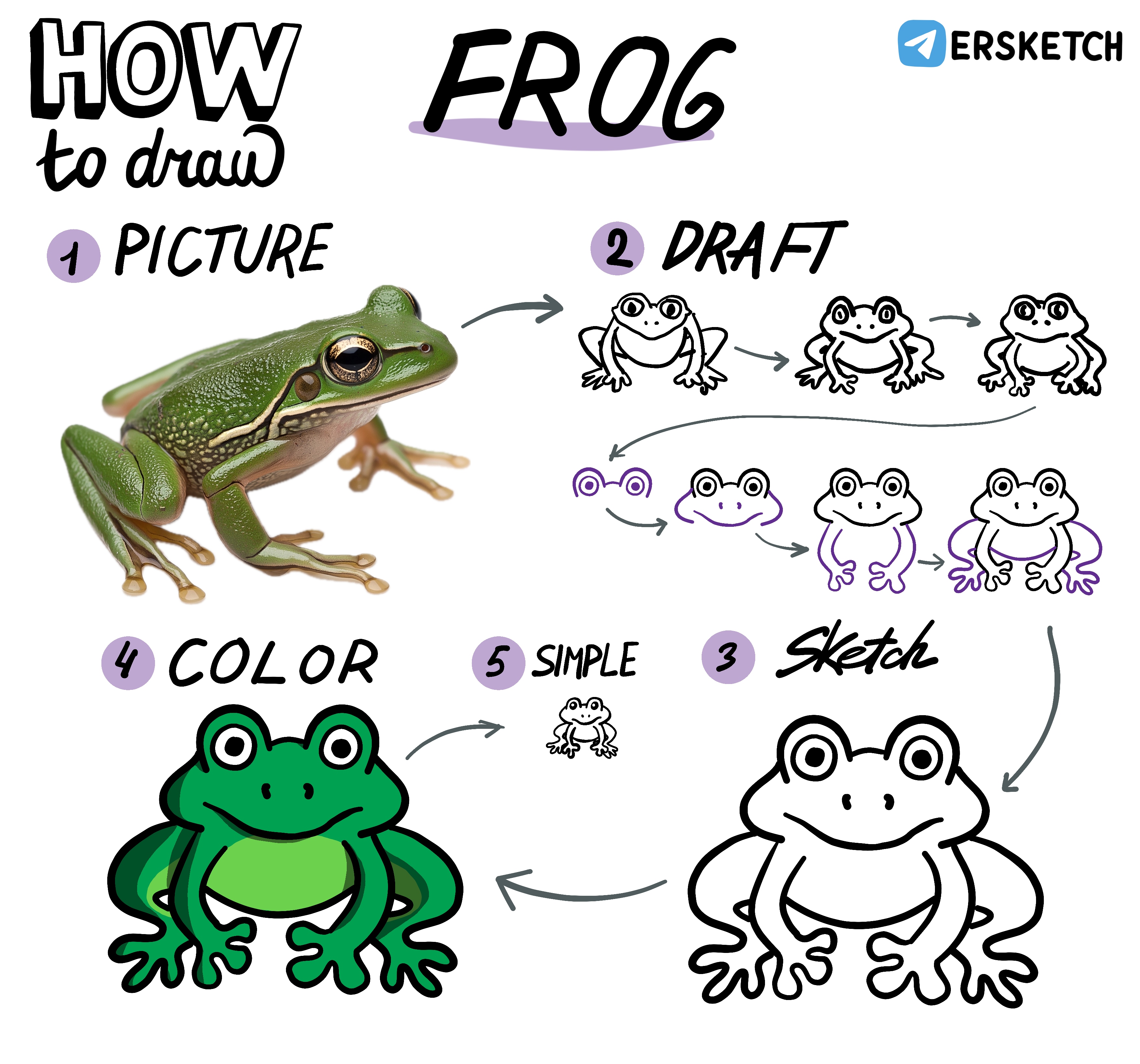 У лягушки большие глаза, которые торчат вверх из треугольной мордочки. Передние лапки маленькие, задние — побольше и торчат коленками в стороны. Между лапками видно пузо.