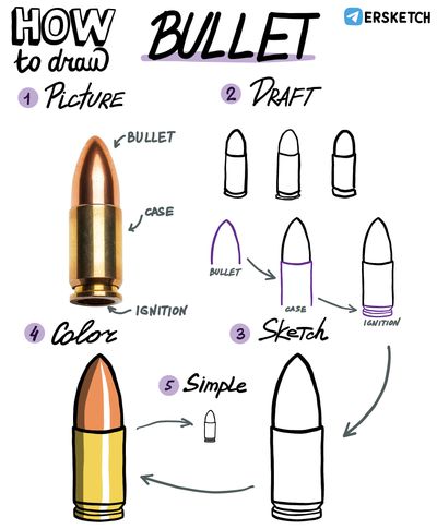 Пуля — это то, что вылетает из пистолета при стрельбе, а рисовать мы будем патрон. Помимо самой пули в патроне есть гильза с капсюлем.