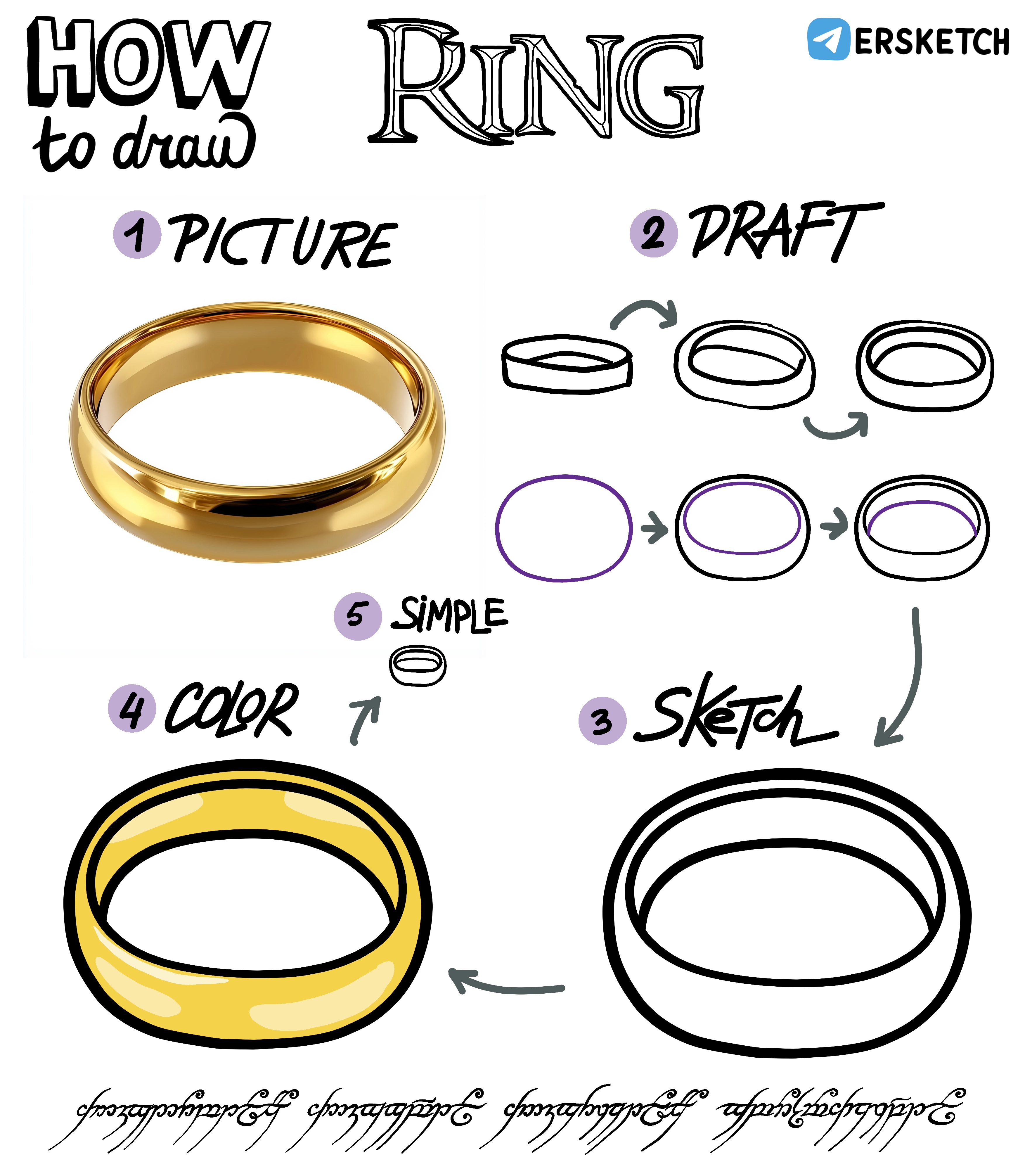 А чтобы получилось кольцо надо нарисовать большой овал а внутри него овал поменьше, смещенный к краю, И ещё один кусочек овала внутри.