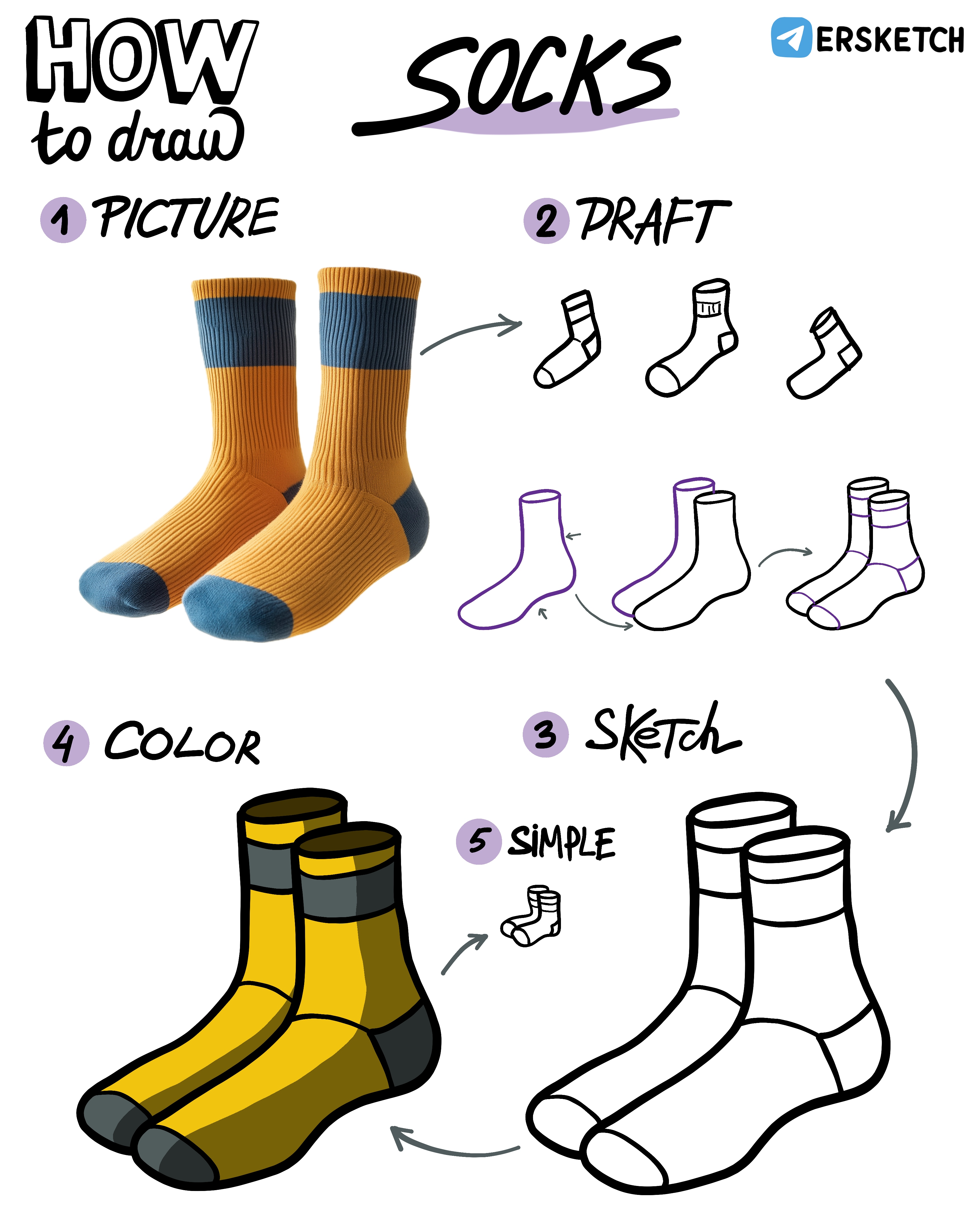 В рисовании носков главное – поймать форму. Они облегают стопу, поэтому есть вогнутая часть на подошве и над пяткой сзади.