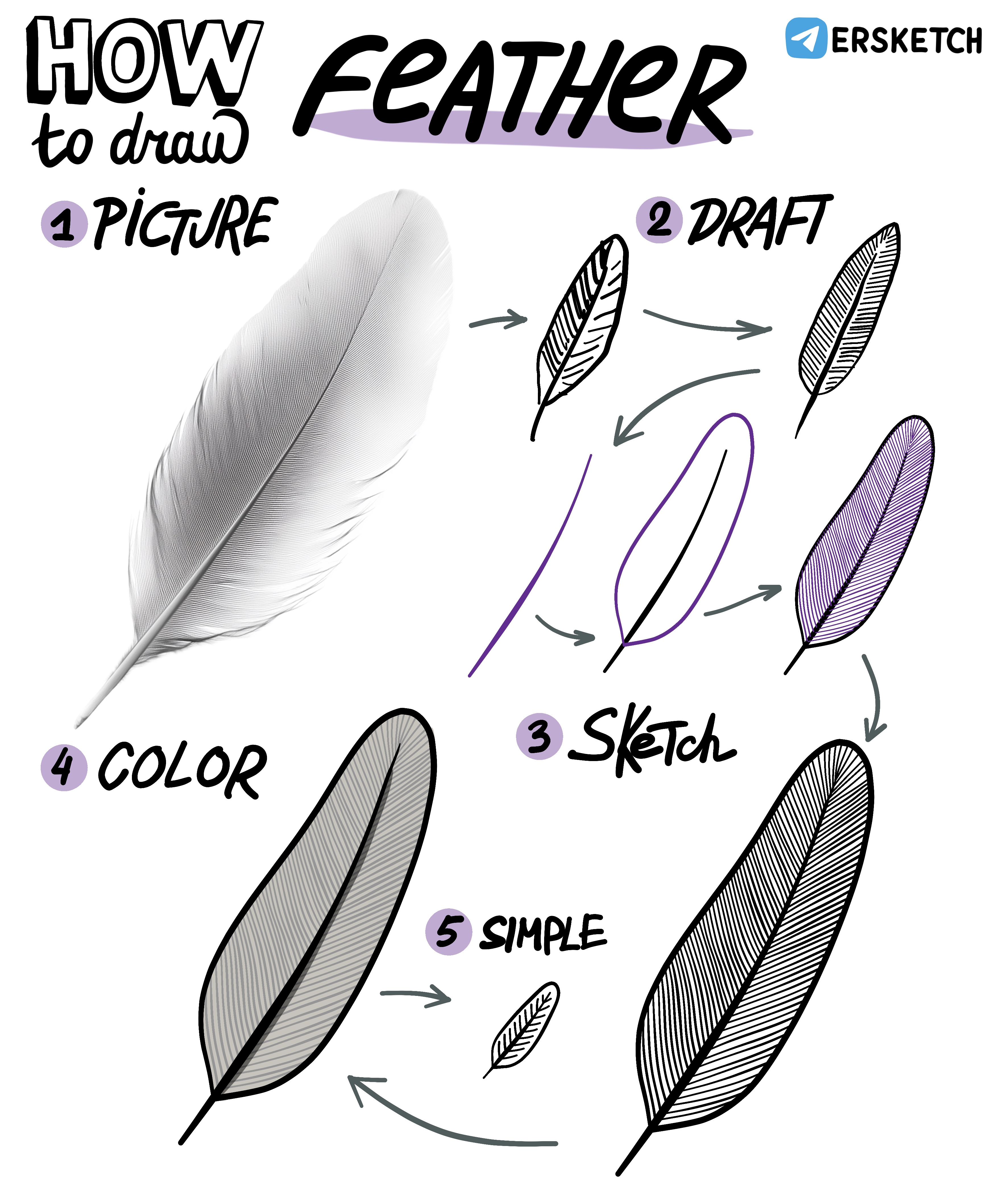 В рисовании пера нет ничего сложного. Оно состоит из центрального стержня и опахала вокруг. Ещё можно линиями показать, что опахало состоит из маленьких волокон.