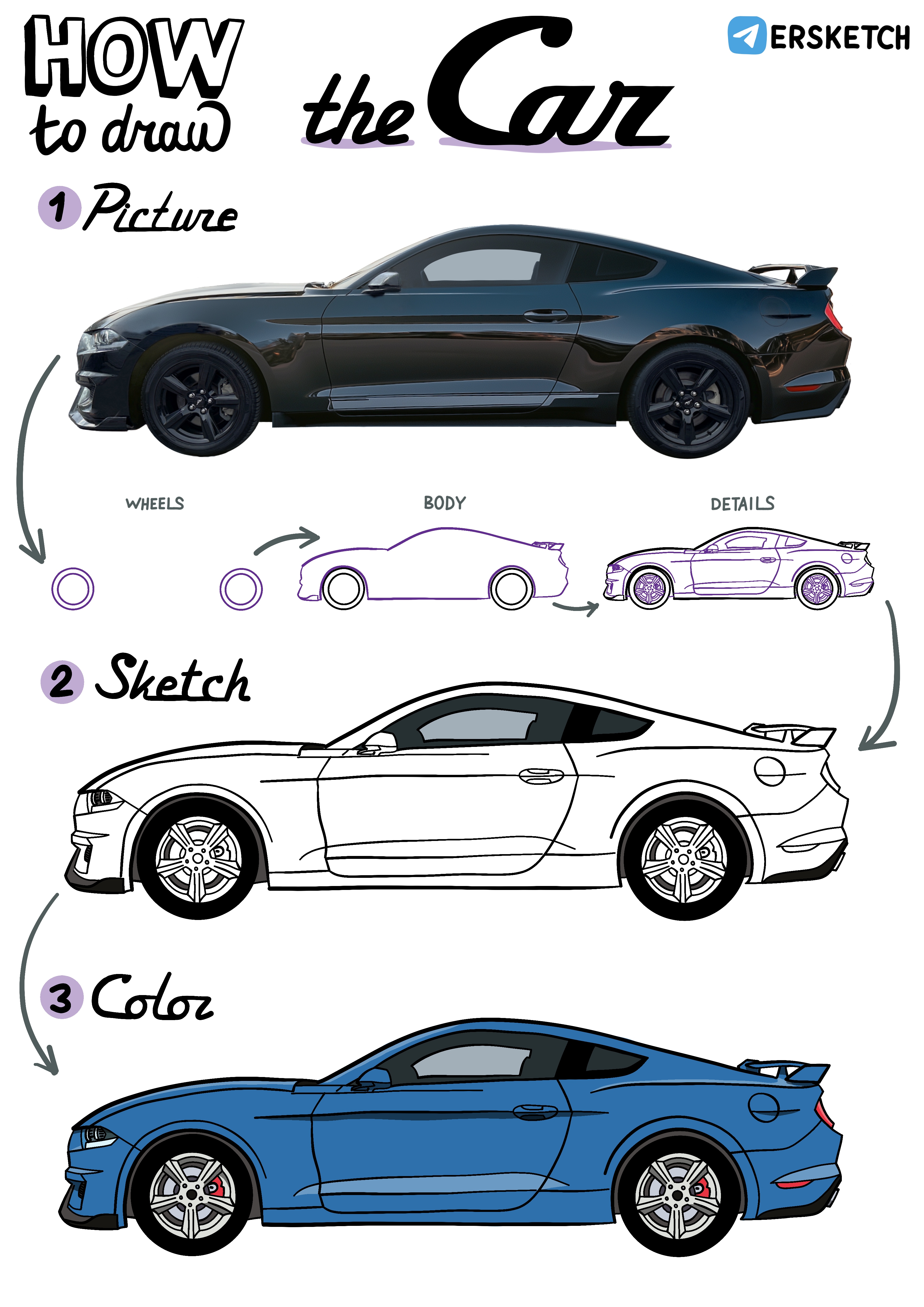 Сначала нужно нарисовать колёса. Дальше - обвести внешний контур толстой уверенной линией. Потом более тонкой линией – детали и грани. После этого убрать изображение и дорисовать пропущенные детали, тени и цвет.