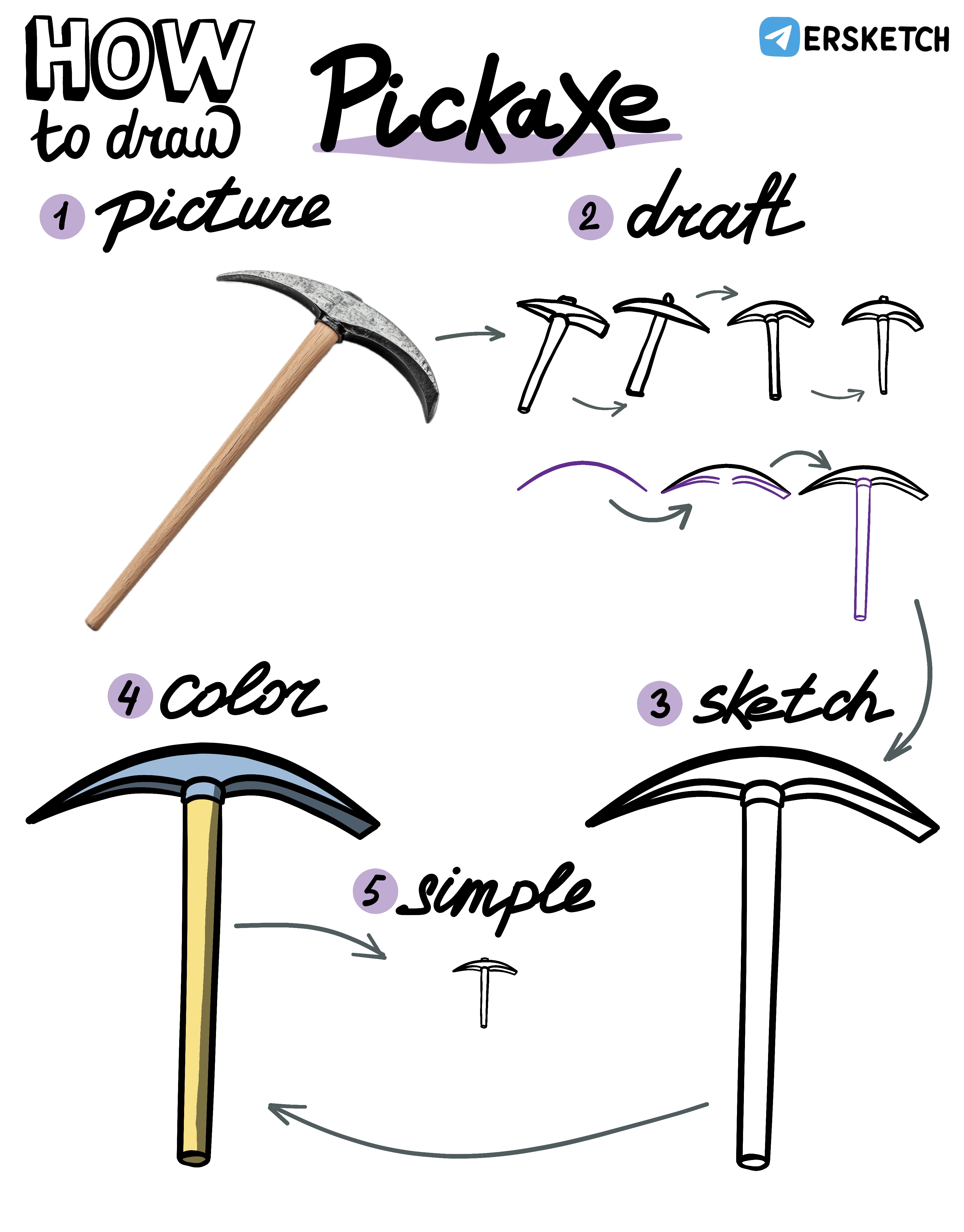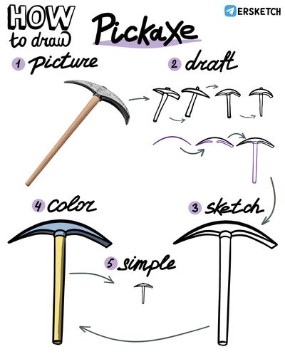 Рисовать кирку начнём с большой дуги её головки. После этого добавим симметричные изгибы с внутренней стороны, придав им объём. Остаётся добавить рукоятку.