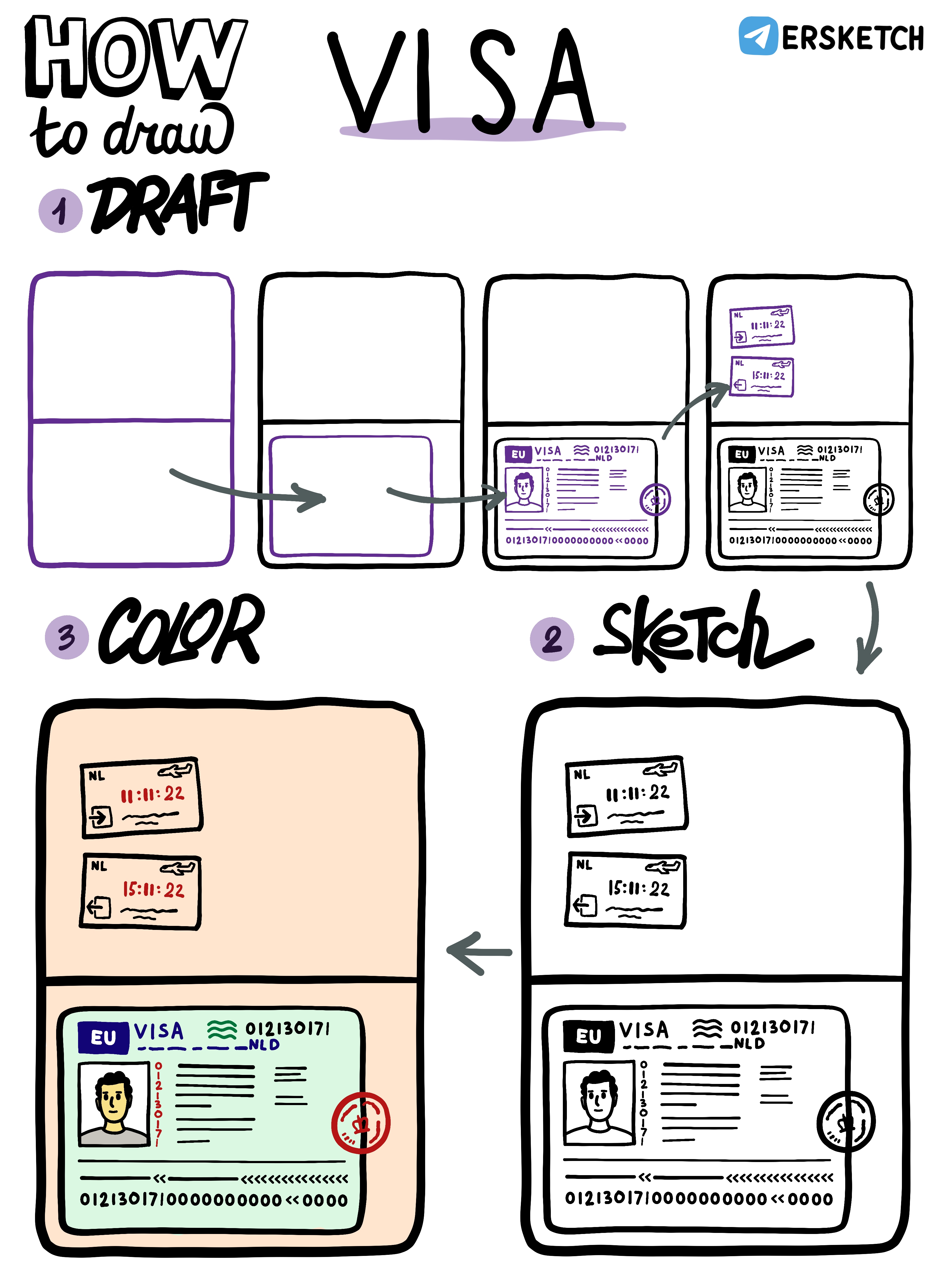 Виза представляет собой наклеечку на странице паспорта, поэтому для того, чтобы её нарисовать, сперва нарисуем паспорт. Потом нарисуем саму наклеечку, добавим на неё фотографию, описание, коды и печать. А чтобы вторая страница паспорта не была пустой, добавим на неё печати о въезде и выезде из страны.