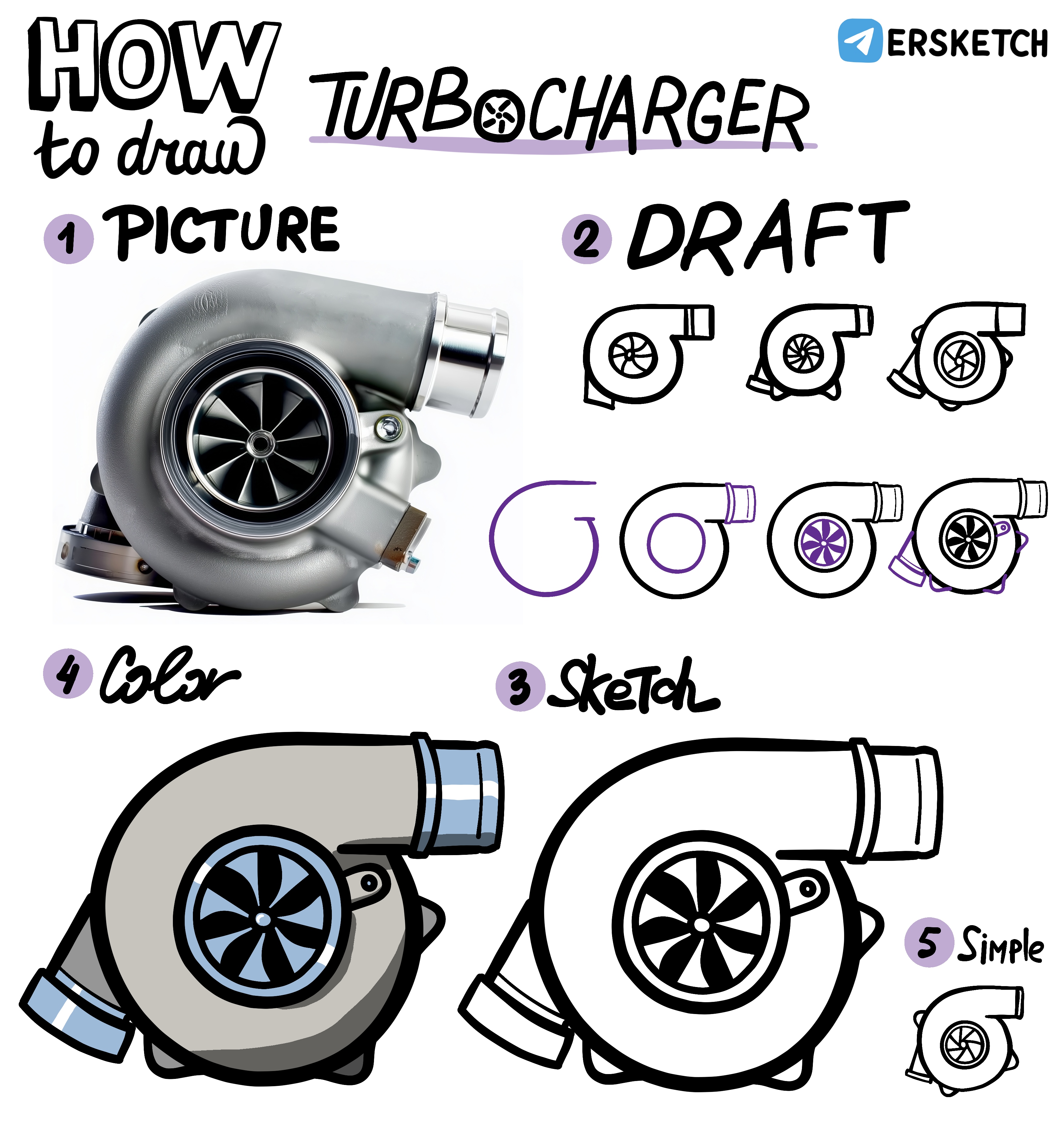 Чтобы нарисовать турбину, нужно представить себе, как она работает. Начните с формы внешней части в виде раковины улитки. Дальше внутри круг с крыльчаткой. Остаётся добавить впуск, выпуск и крепления.