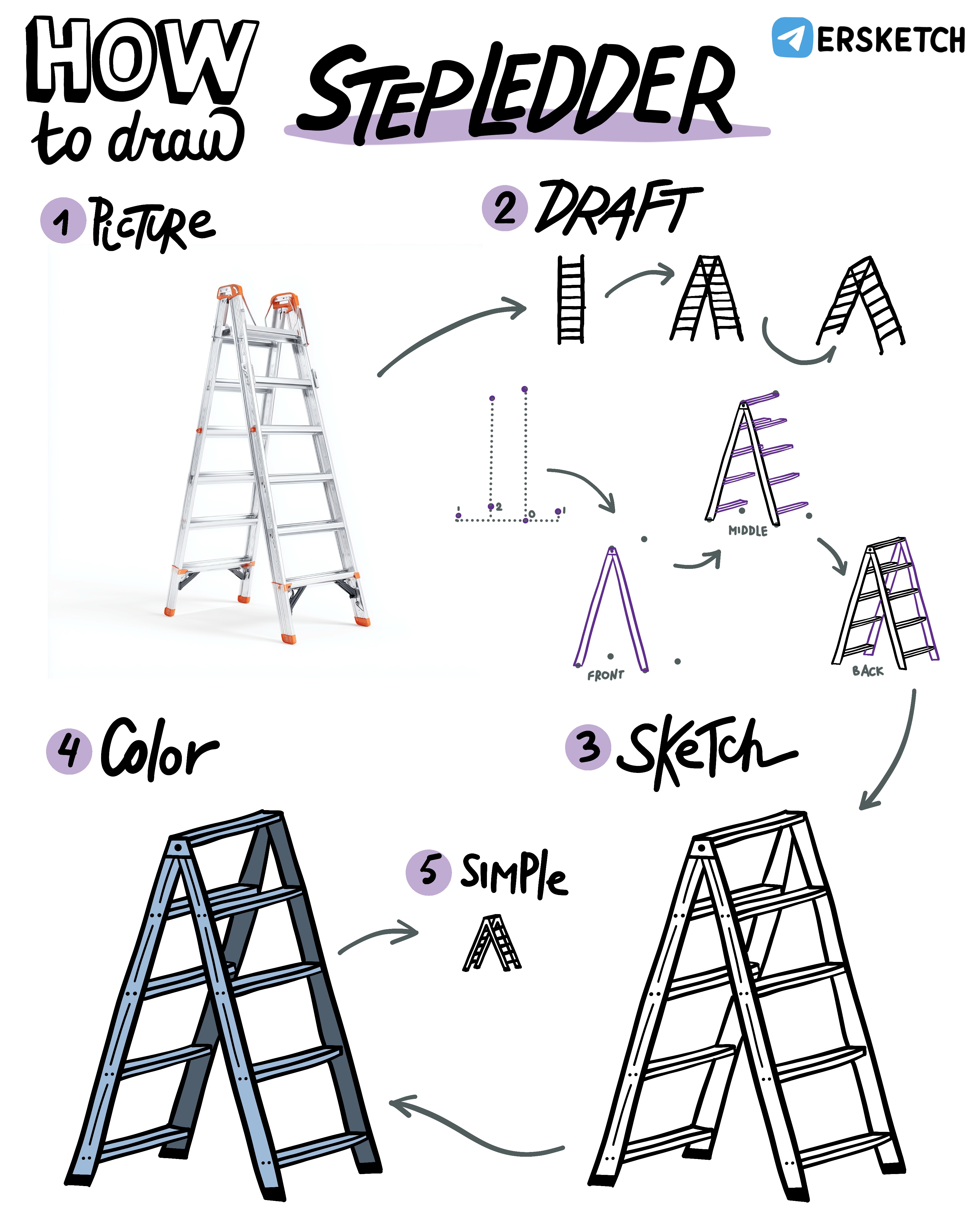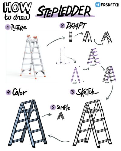 Сегодня будем рисовать стремянку. Задача оказалась неожиданно сложной, так что соберитесь. Чтобы лестница получилась красивой, надо рисовать ее в проекции. И чтобы не пришлось стирать лишние линии, попробуем сделать это по слоям.