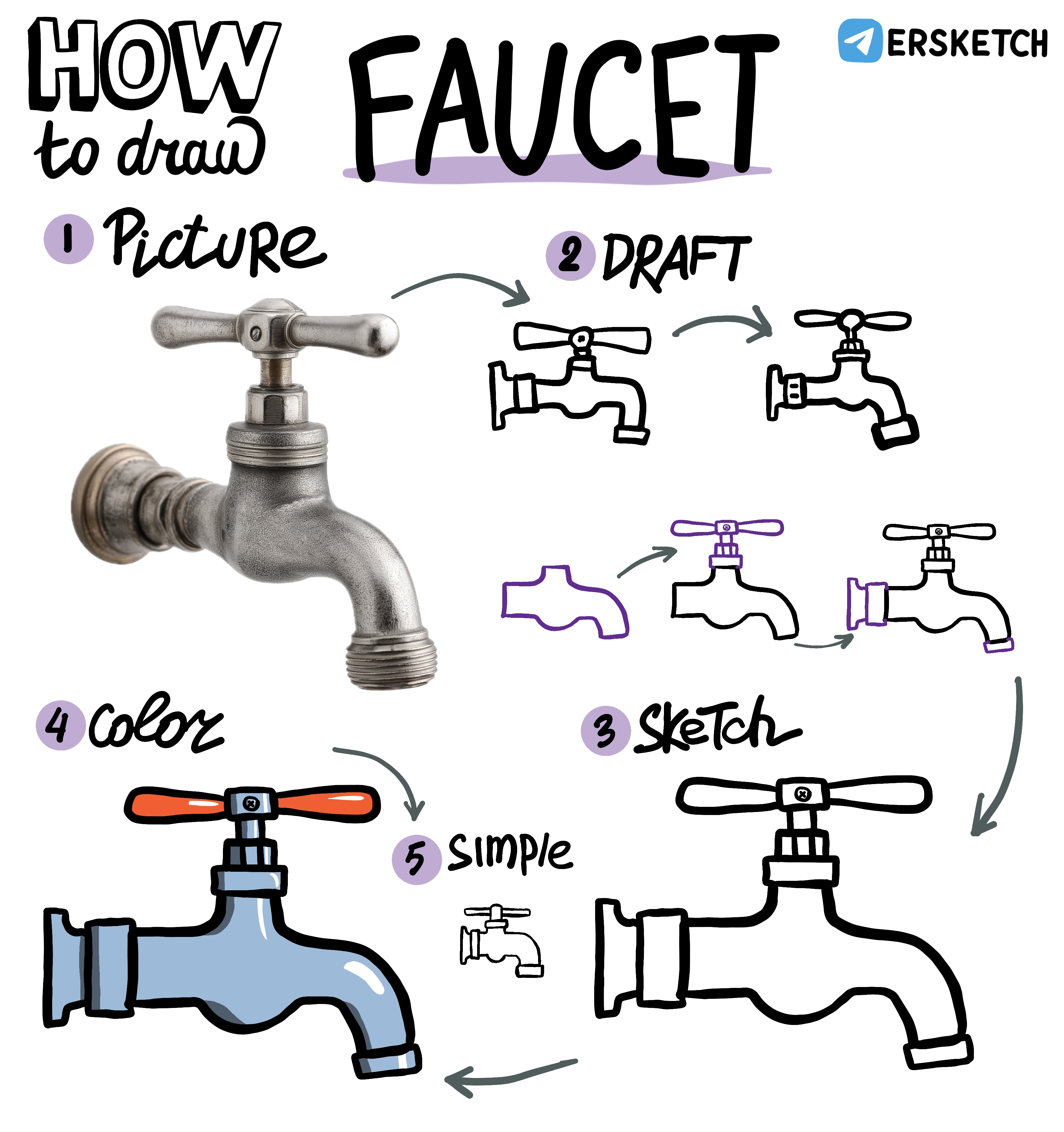 Я начинаю рисовать кран с трубки, с местом для ручки сверху и утолщением снизу. Потом нарисую ручку сверху, крепление к стене и кончик крана. Получается довольно просто.