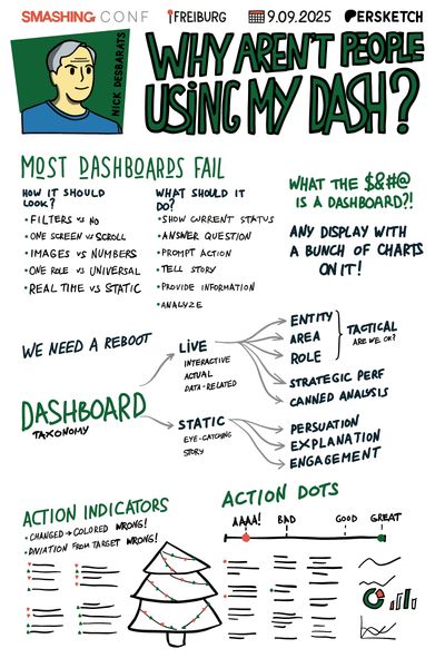 Скетчноут к докладу Nick Desbarats на SmashingConf, который объясняет, чем хороший дашборд отличается от новогодней новогодней ёлки.