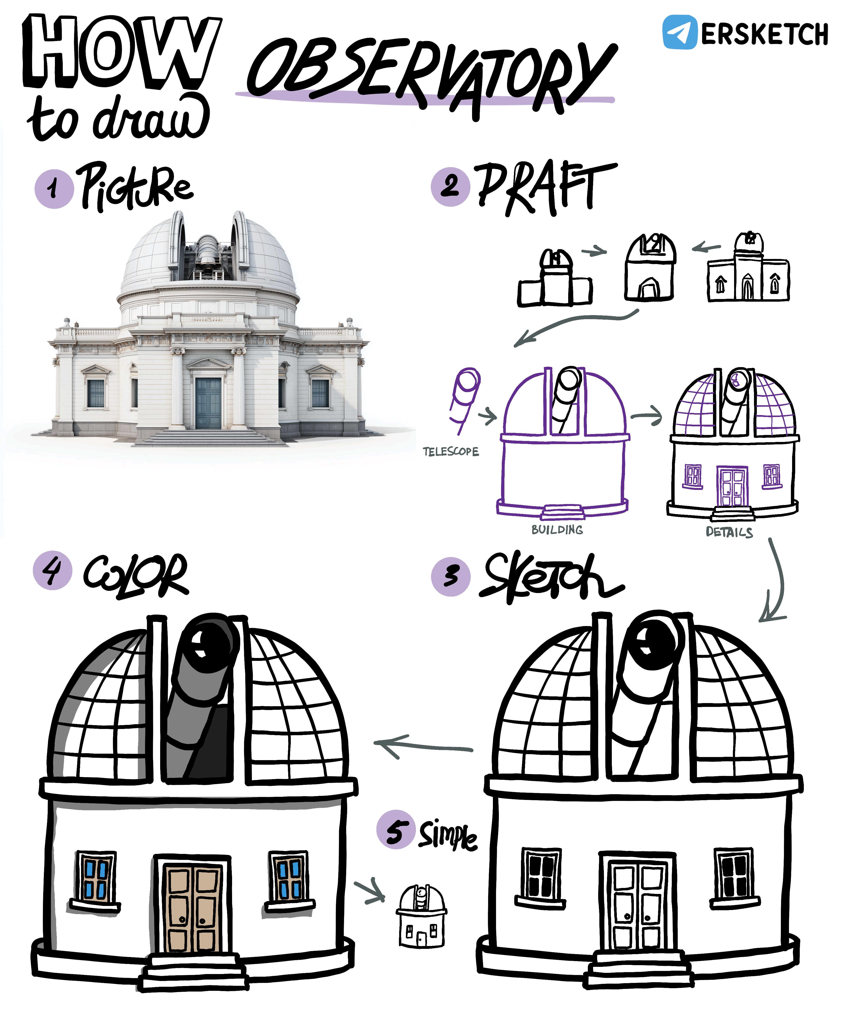Обсерваторию надо начинать рисовать с телескопа, он там самое главное. Вокруг него – крыша, а под крышей – здание обсерватории.