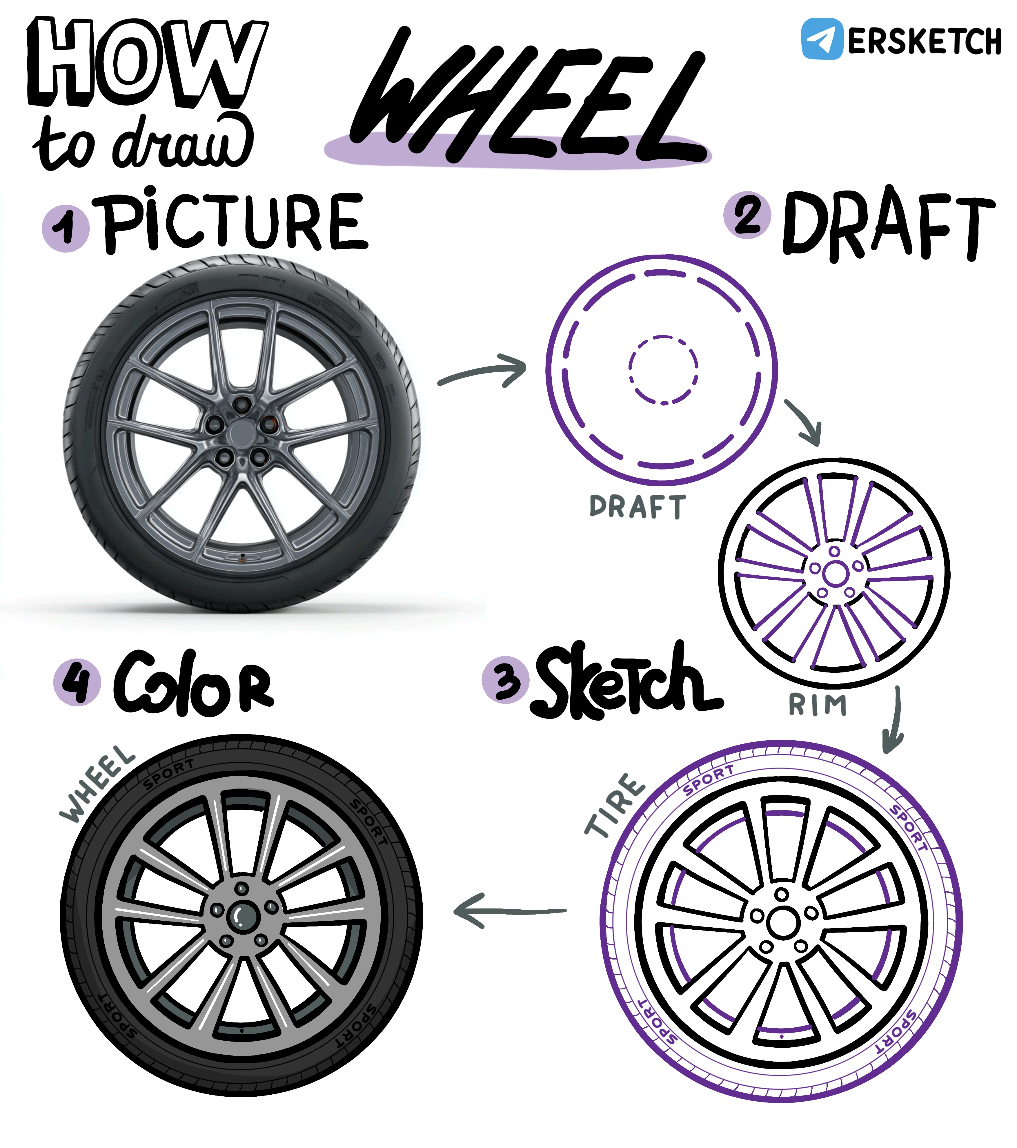 И снаружи нарисовать шину. В шине можно сделать рисунок протектора и надписи, чтобы она смотрелась интереснее.