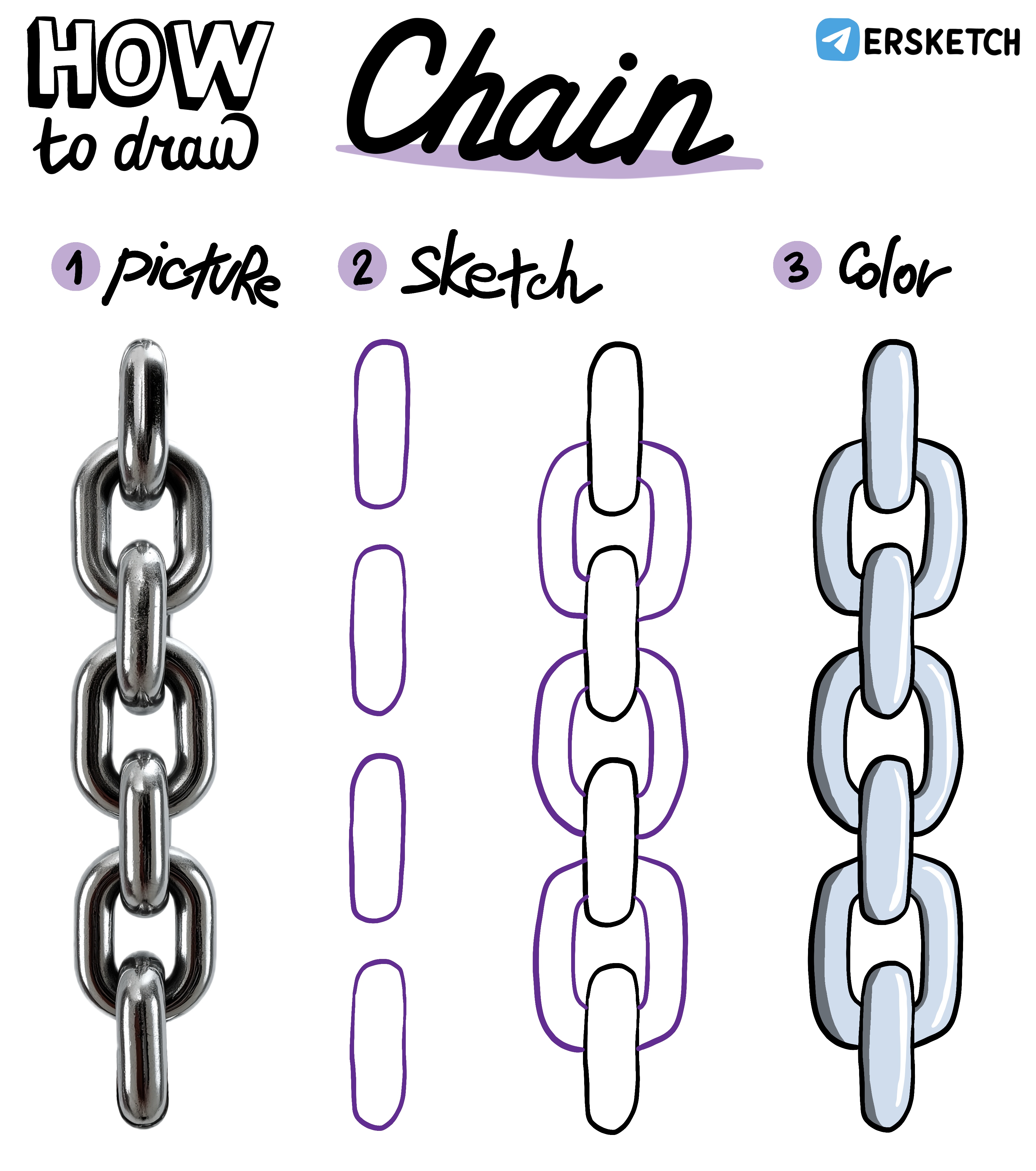 Чтобы нарисовать узнаваемую цепь, достаточно двух-трёх звеньев, но при желании можно нарисовать и больше.