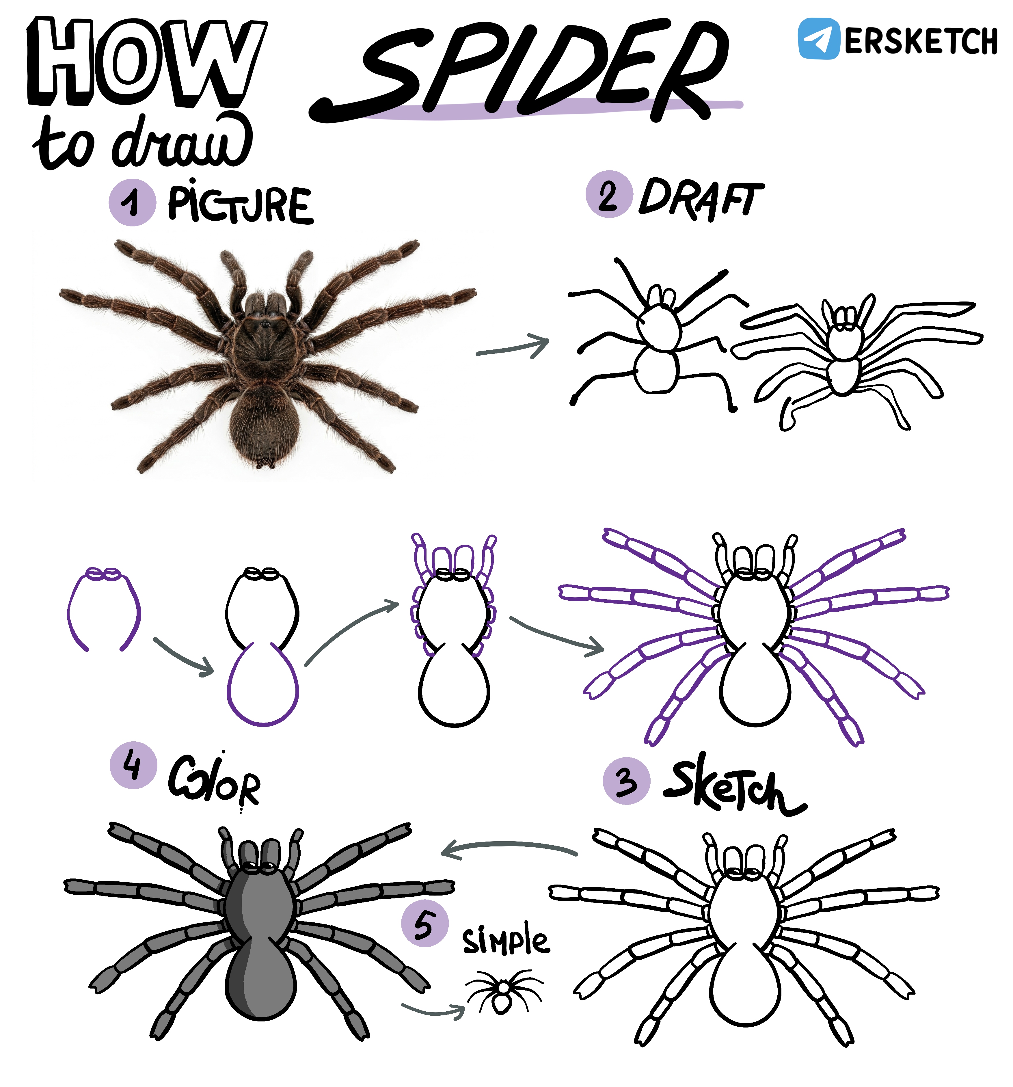 Я начинаю рисовать с головогруди, потом намечаю места для лапок. Дальше – самое сложное: правильно передать форму и длину лапок. Остаётся только нарисовать брюшко.